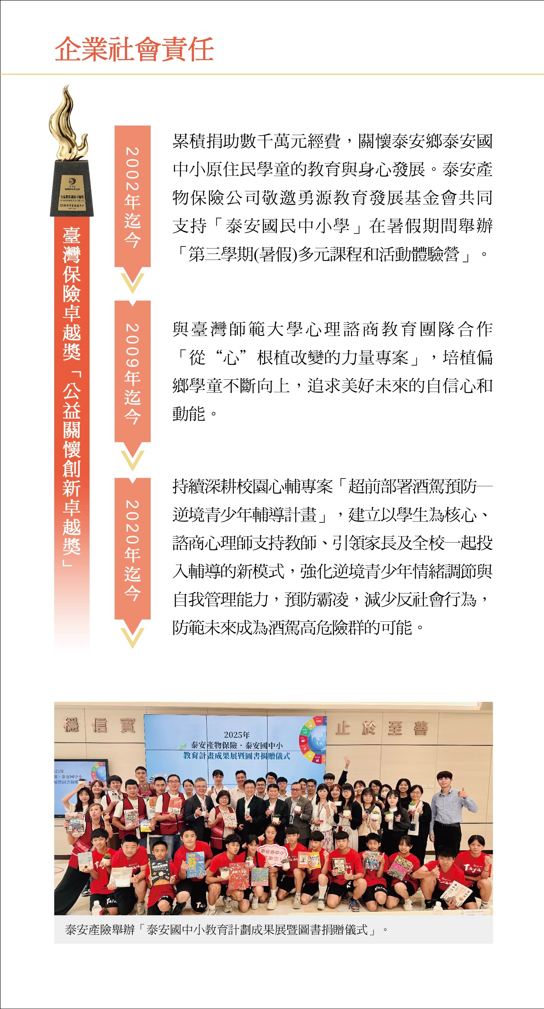 - 2002年起,累積捐助數千萬元經費,關懷泰安鄉泰安國中小原住民學童的教育與身心發展,讓資源相對有限的偏鄉原住民學童,在暑期學習不中斷,得以擁有一個快樂充實的暑假。